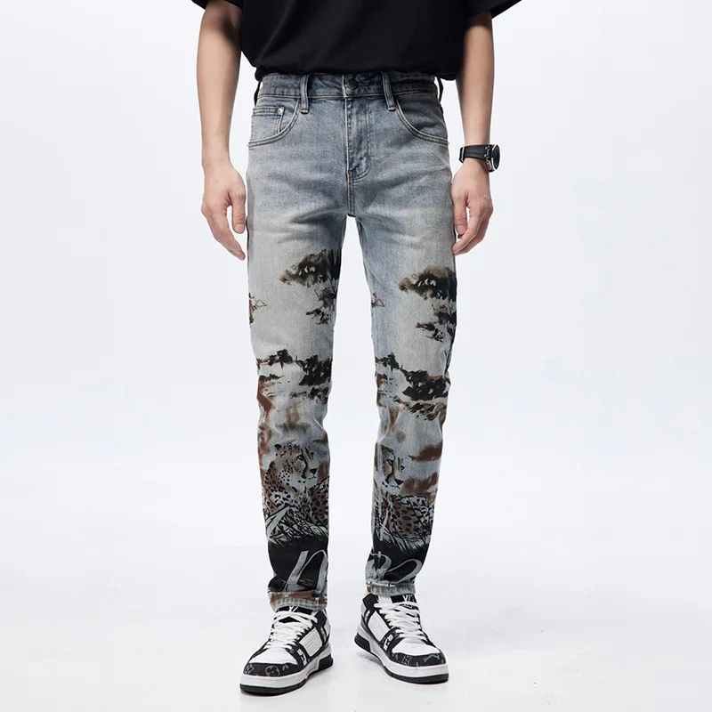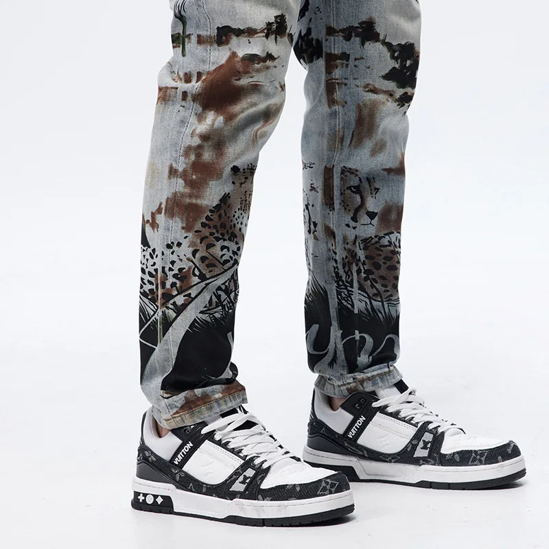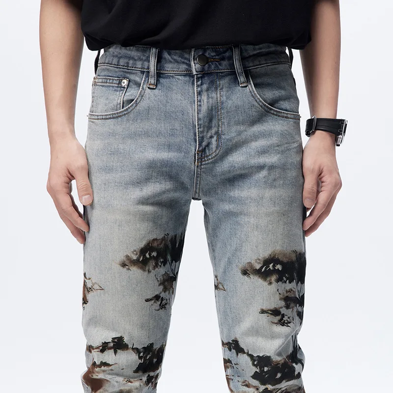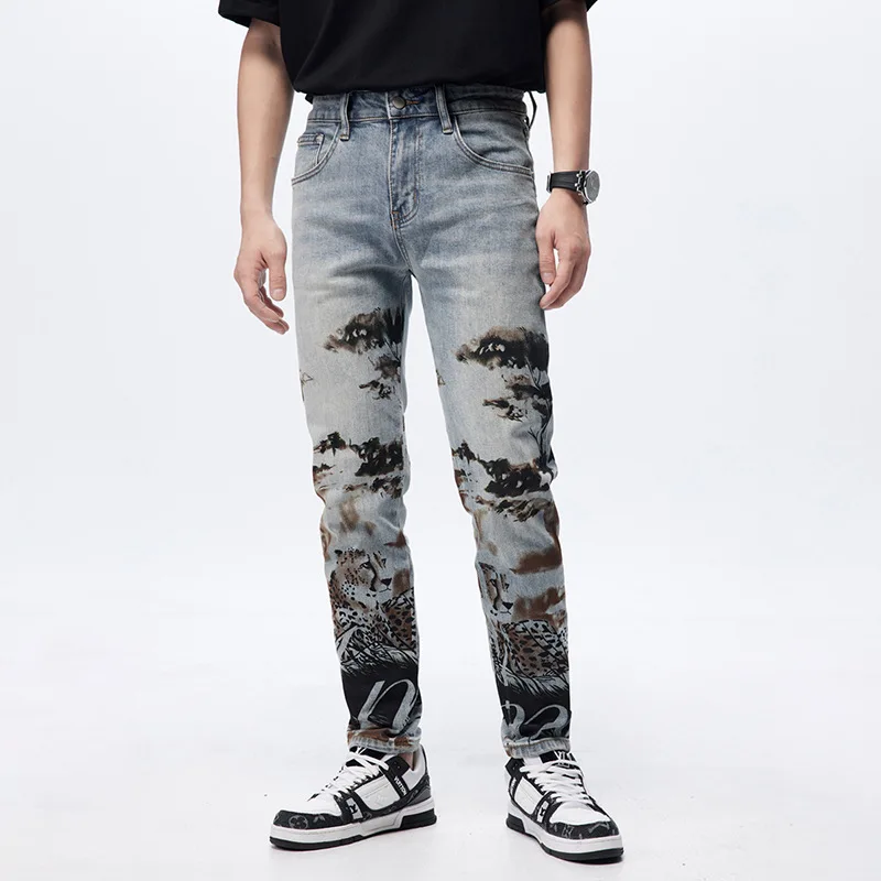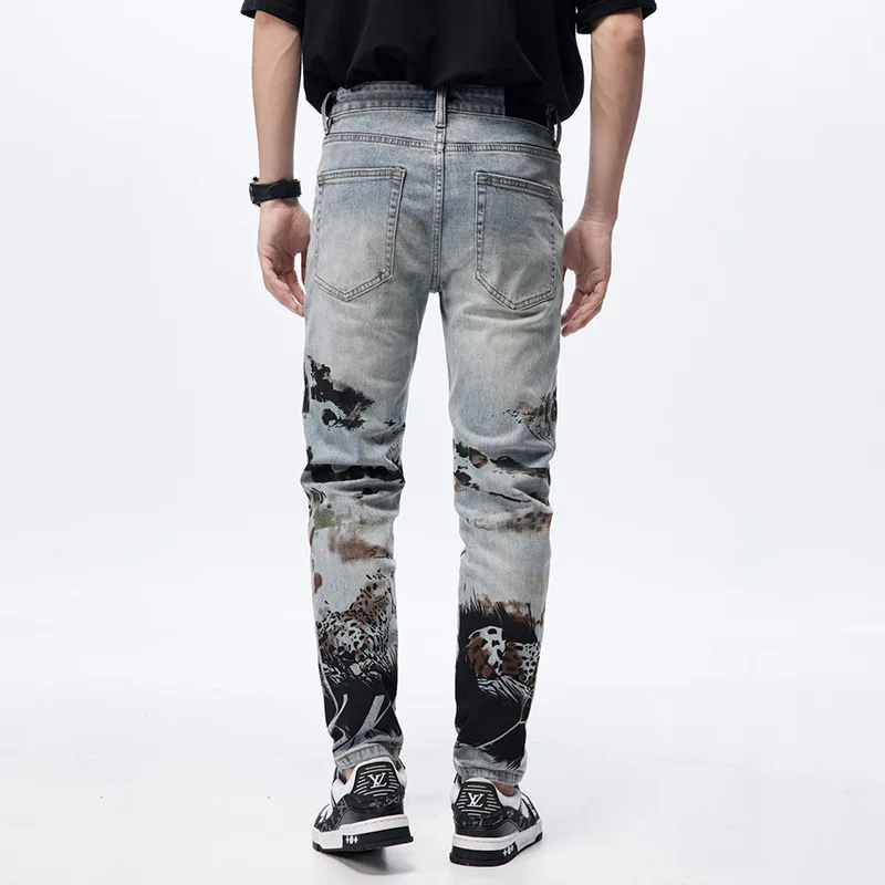 Blue Zipper Fly High Quality Streetwear Distressing Ripped Printing Fashion Design Jeans