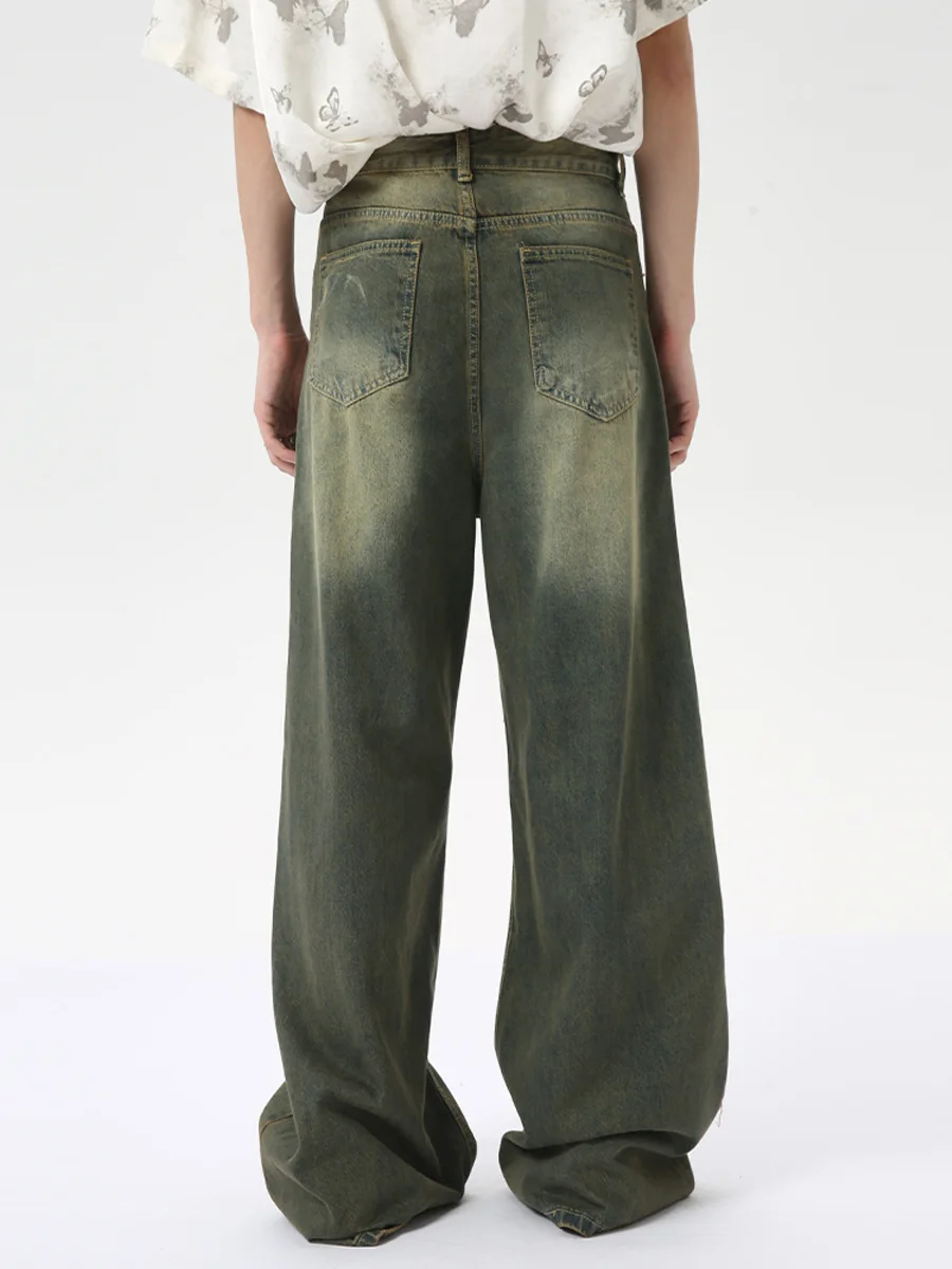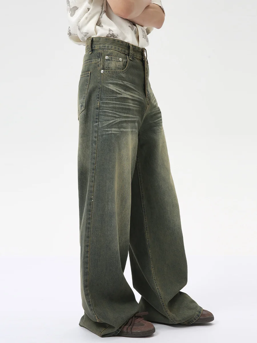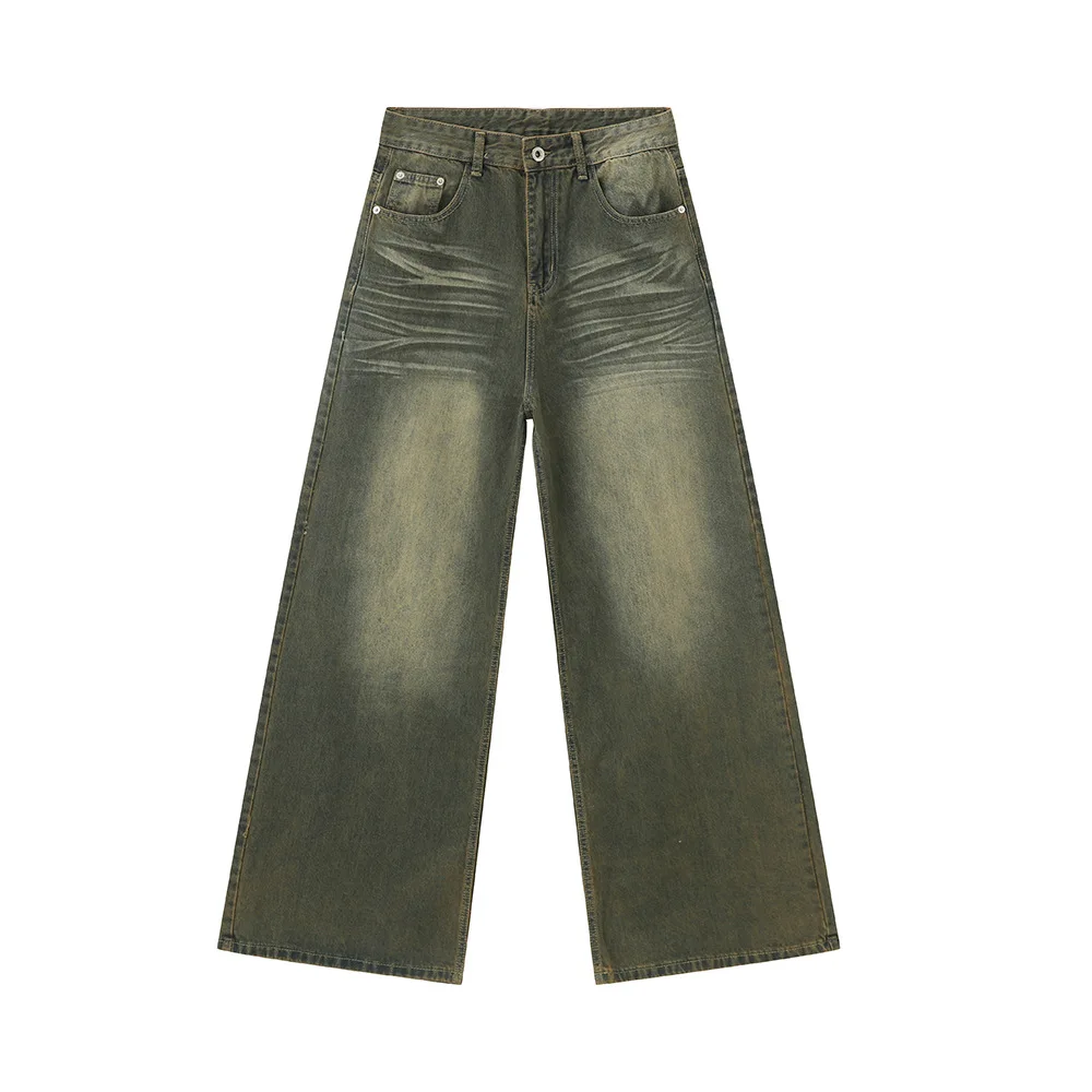 American Street Vintage Acid Wash Green Wide Leg Cotton Fashion Jeans Whisker Fade Straight Carpenter Jeans Baggy Designer Jeans