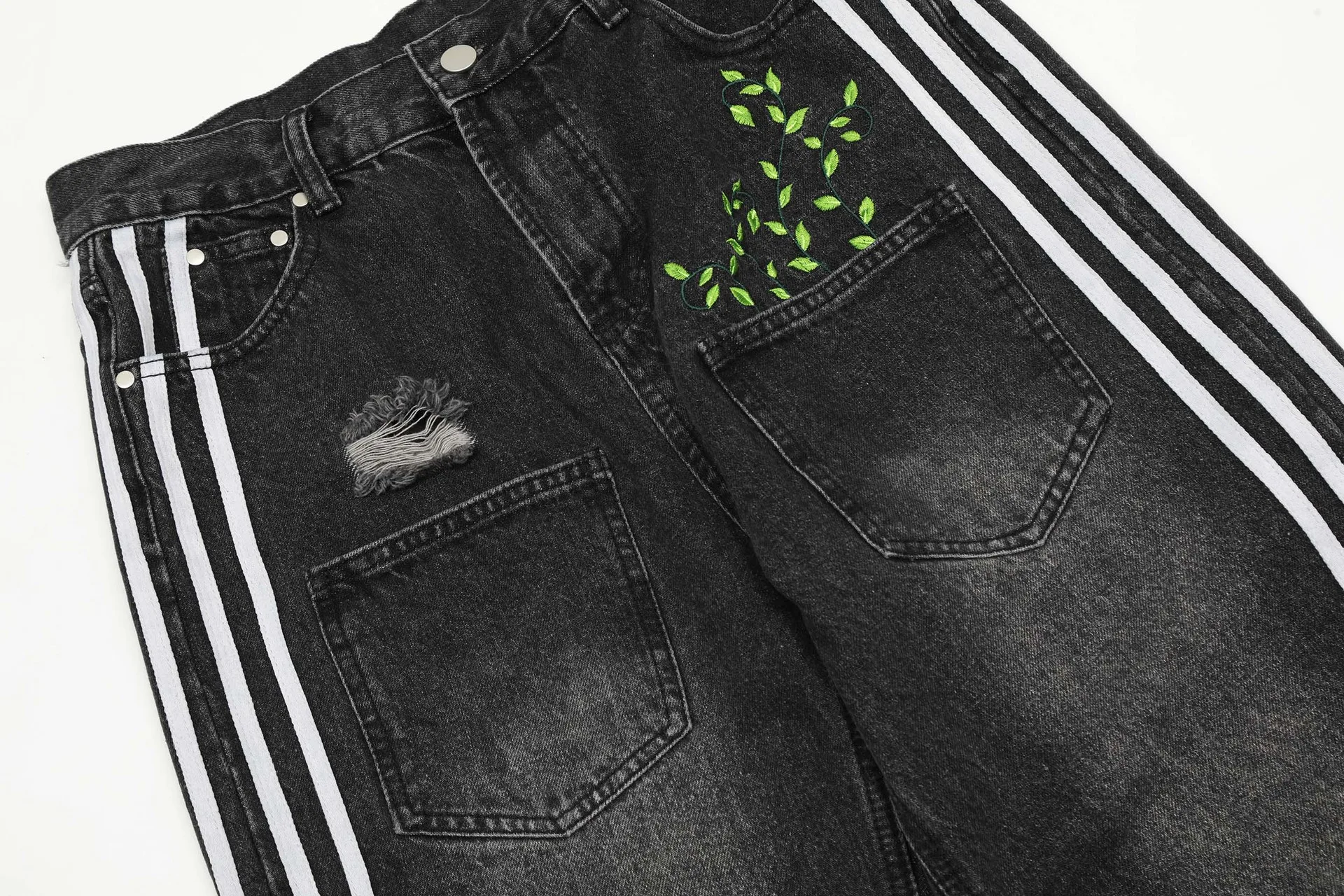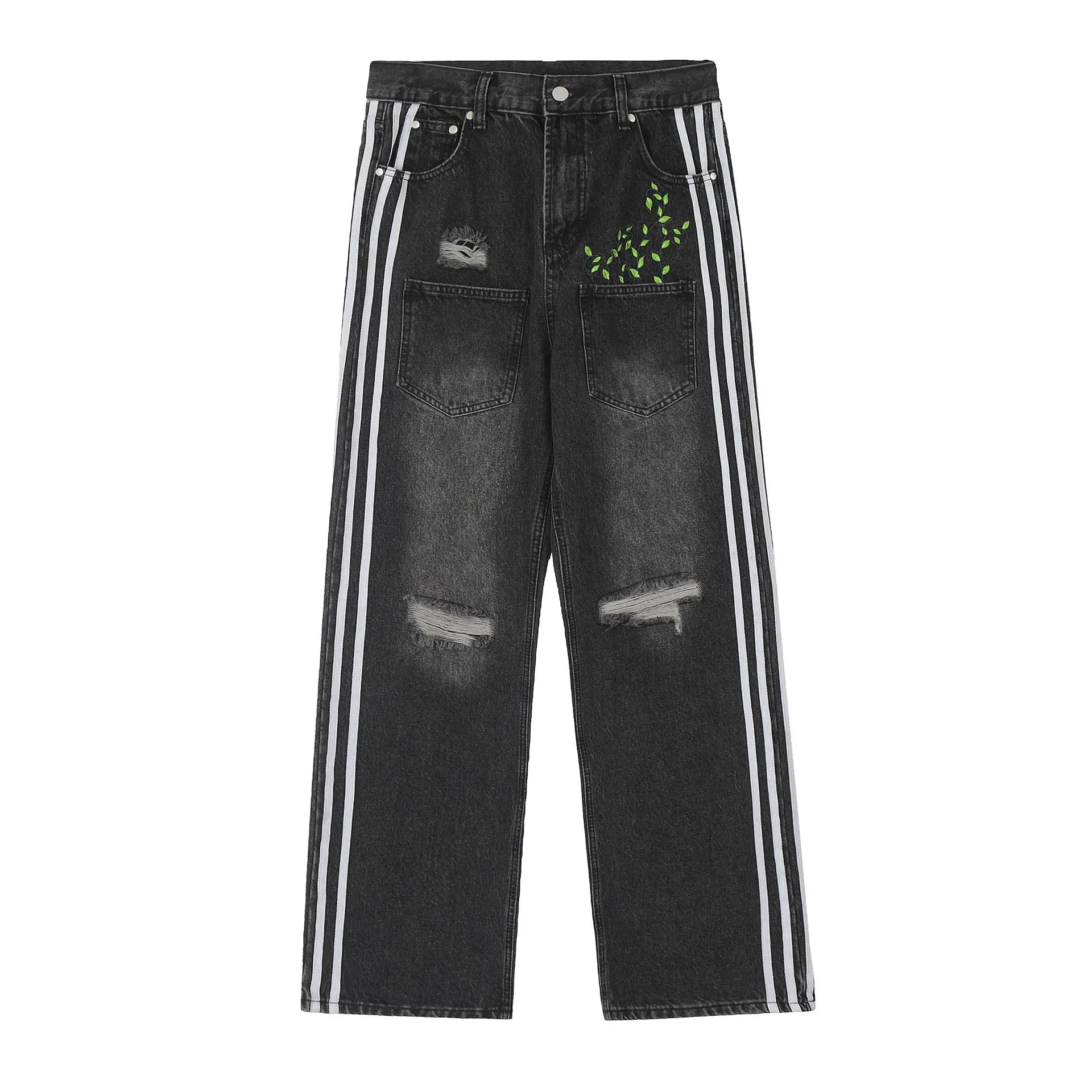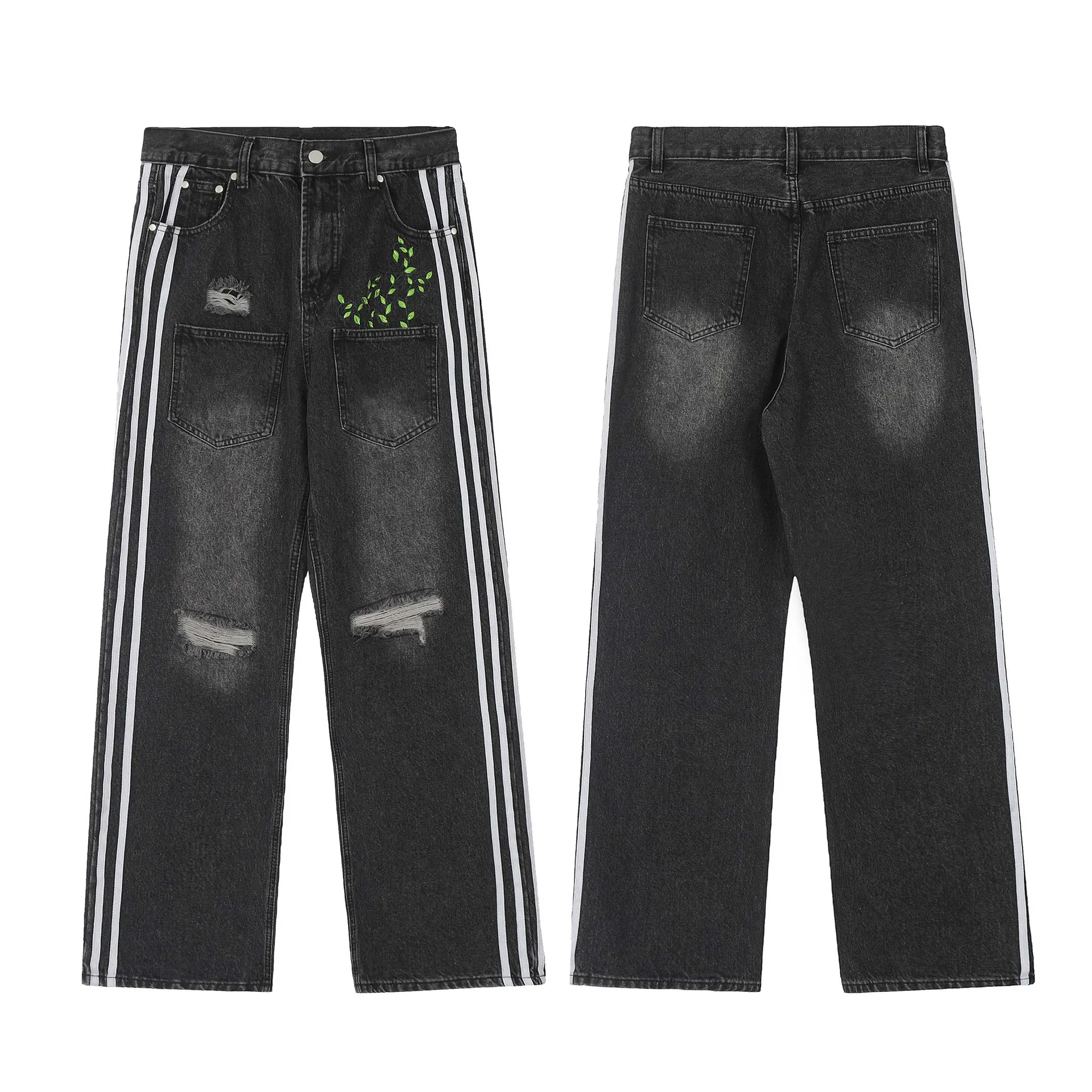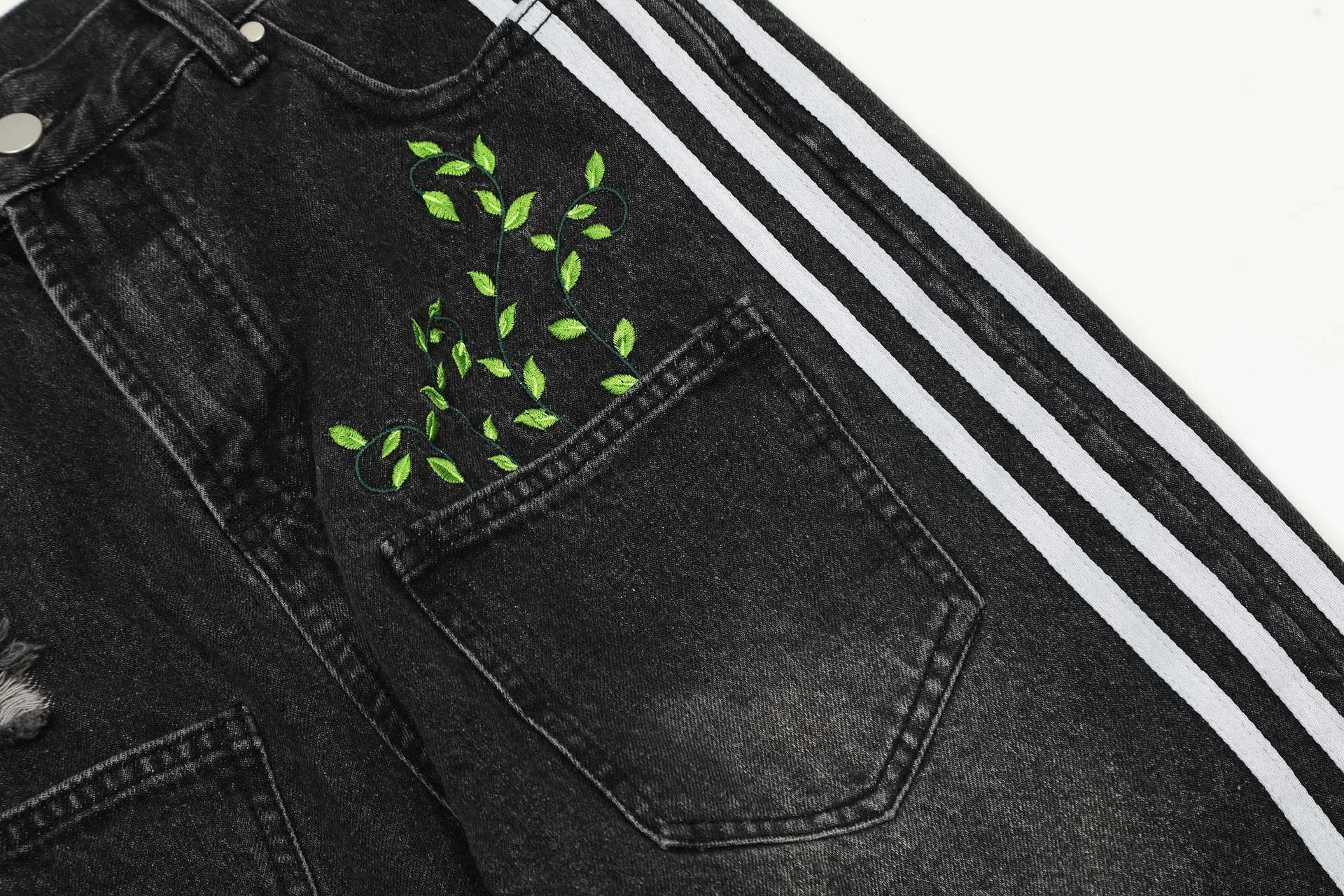 American Three Stripes Leaf Embroidery Men Denim Pant Streetwear Mens Designer Jeans