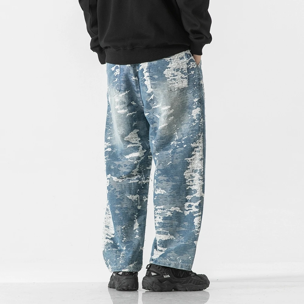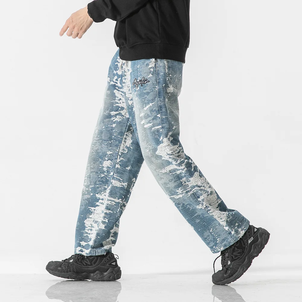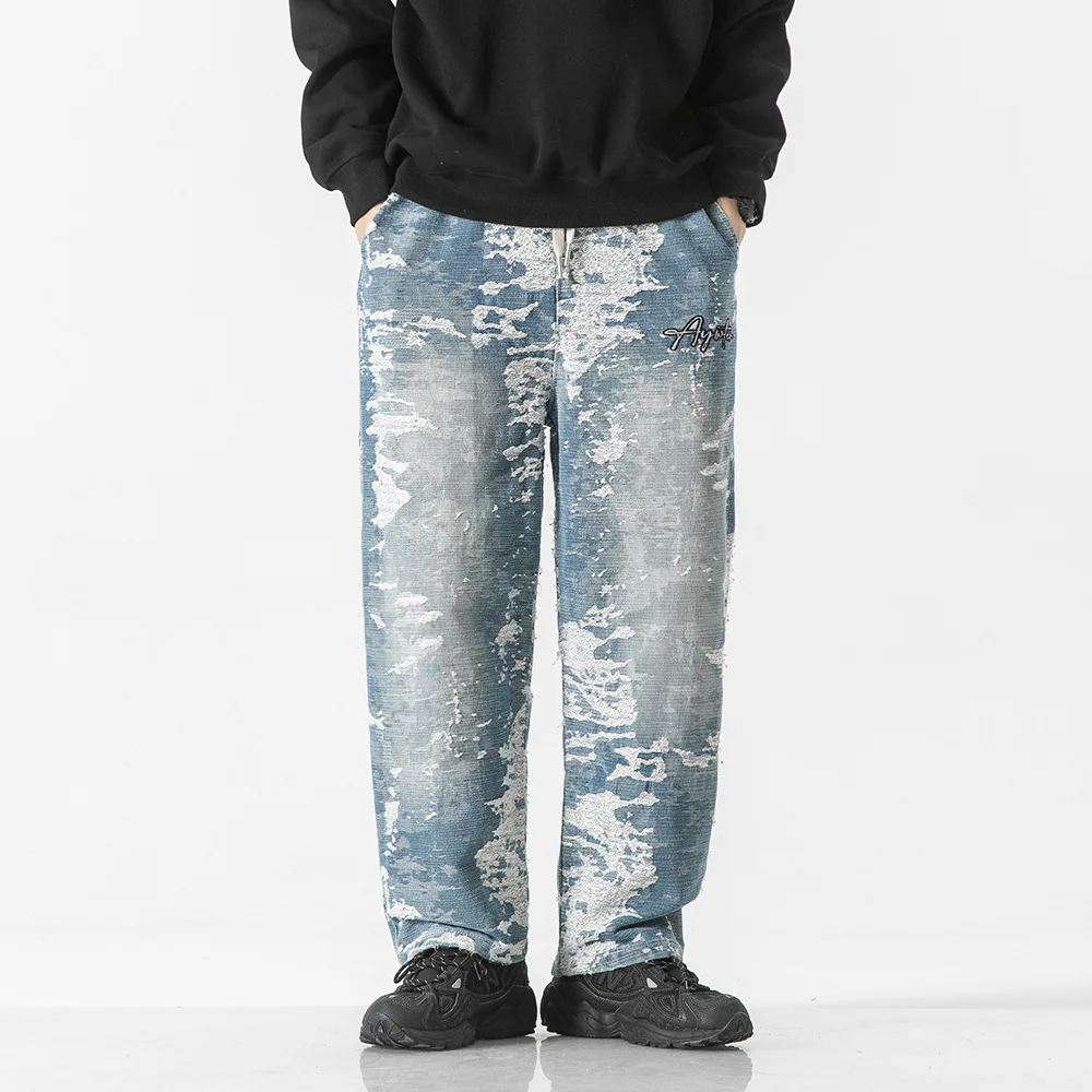 Blue Distressed Embroidery Damaged Baggy Streetwear Pants Mens Designer Jeans
