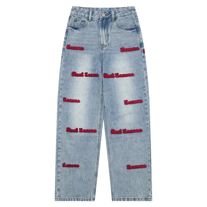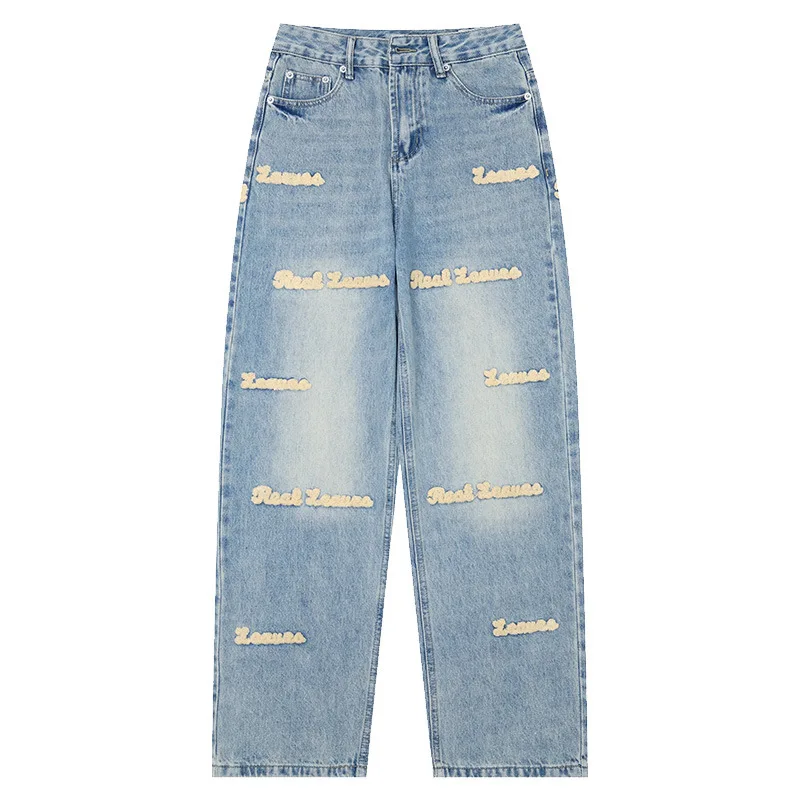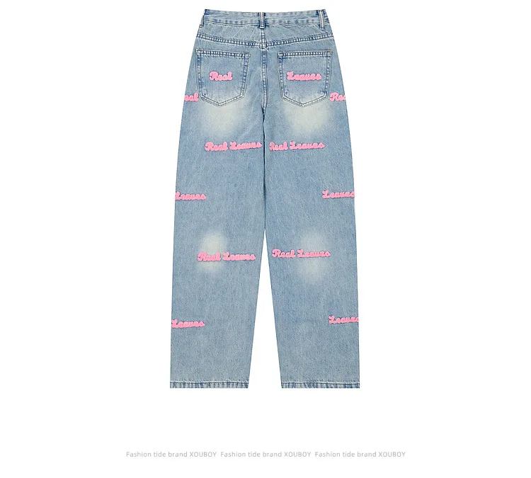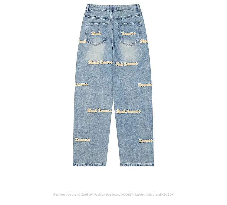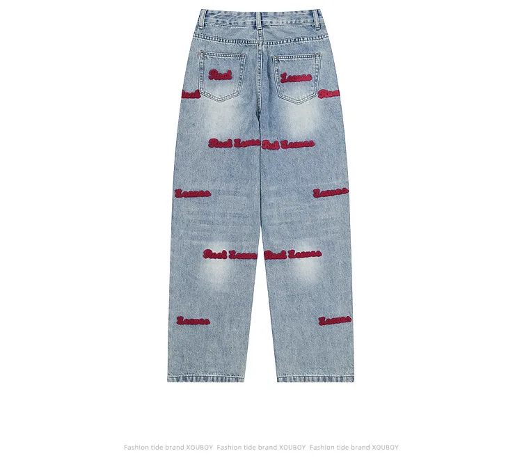 Blue Simple Style Towel Embroidery Wide Jeans Men Tapered Mobile Pant for Man Jeans Baggy